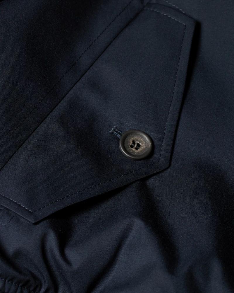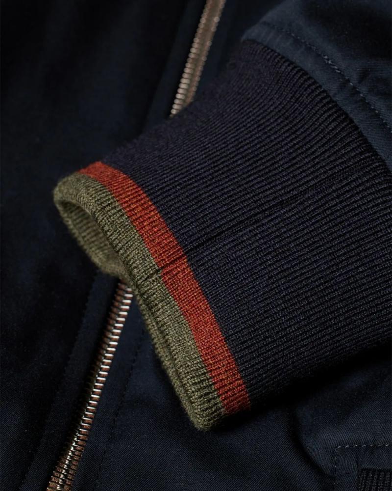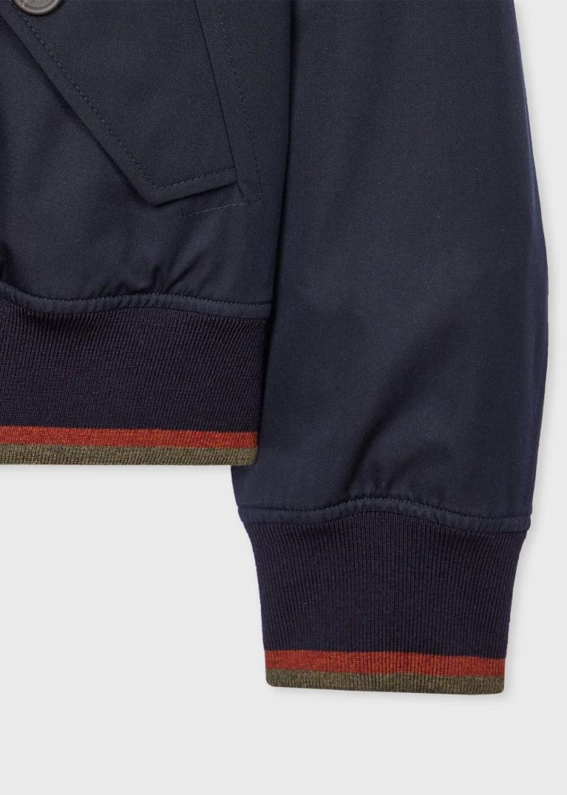 Made in the UK from a water resistant cotton-twill from the Grenfell mill, this navy Harrington jacket features a timeless design. Fully lined in deadstock fabric from previous Paul Smith collections, this jacket is finished with recycled paper buttons and rib-knit cuffs with two-colour stripe tipping.