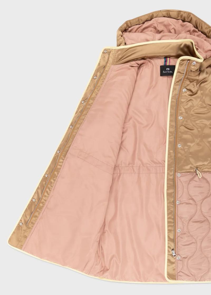 Made from a polyester-blend satin, this camel coat features a quilted construction with wadding for added warmth. Cut for a mid-length shape, this coat is finished with contrast matte pink hem and a detachable hood.