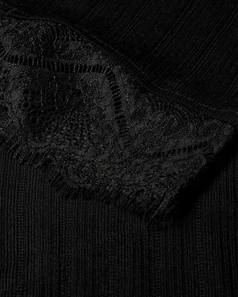 Elevate your wardrobe during the transitional season with this knitted black dress, featuring intricate lace inserts for a feminine touch. This long-sleeved midi dress design features fit and flare styling and pointelle knit construction for a light and floaty feel. Pair this dress with an additional lightweight layer or wear it individually on a breezy night with sleek ankle boots.