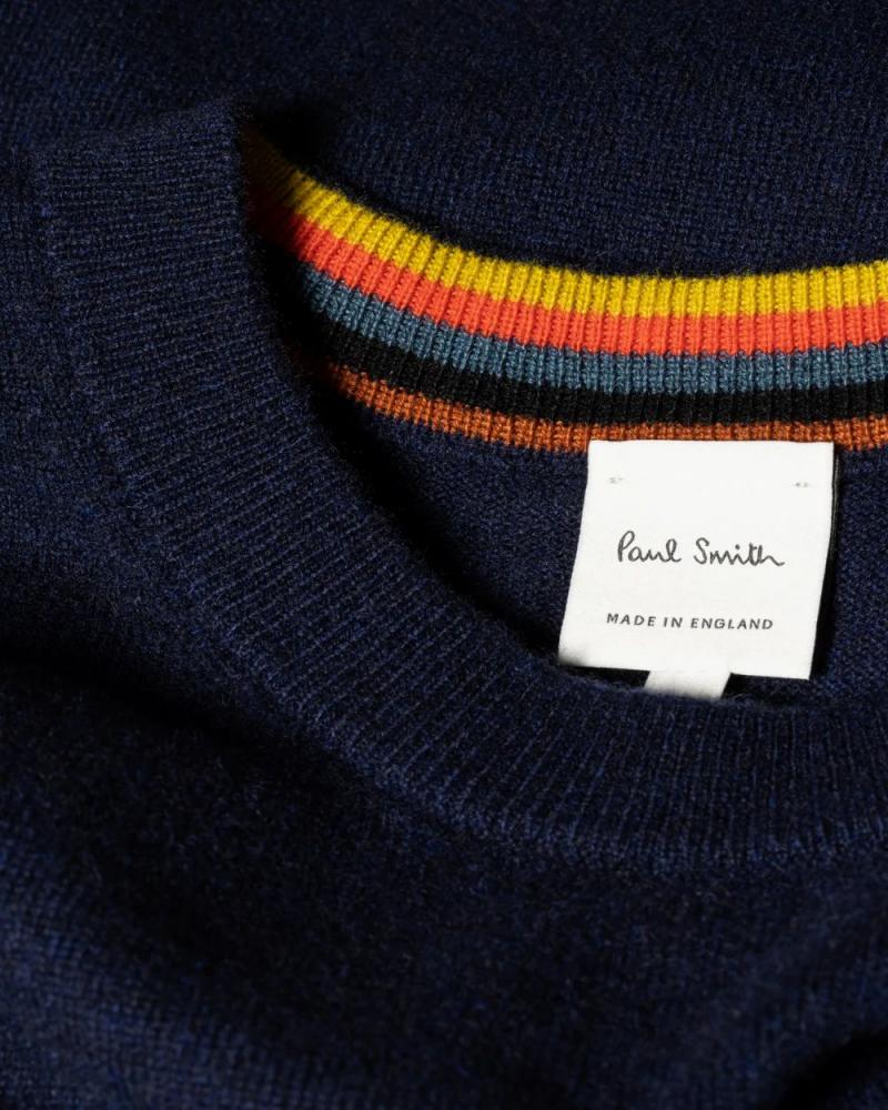 Cut from soft-to-touch cashmere which is spun in the UK by Todd & Duncan at their Loch Leven Mill in Scotland, this navy crew neck sweater takes a timeless silhouette. Finished with our ‘Artist Stripe’ inside the collar and on the sleeve cuff edge, this sweater provides a casual alternative to a formal shirt when worn under tailoring.