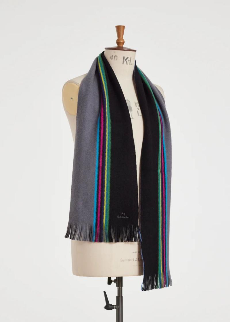 Made in Germany from rich merino wool the reversible black scarf features a colour block design with ‘Sports Stripe’ detailing on one side and tonal stripe detailing on the reverse. The scarf is complete with subtle branding and contrast tipping.