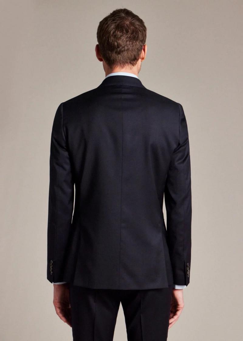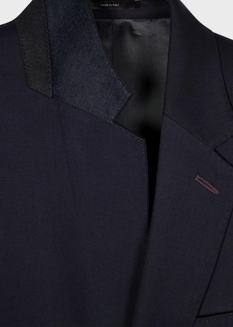 Crafted in Italy from a fine wool twill, this navy two-button suit features a notched lapel and flap pockets. Complete with a full cupro lining with a contrasting book design on one side panel – adding a playful twist to this classic style. Cut for a tailored-fit, this suit is complete with tailored trousers with angled side pockets.