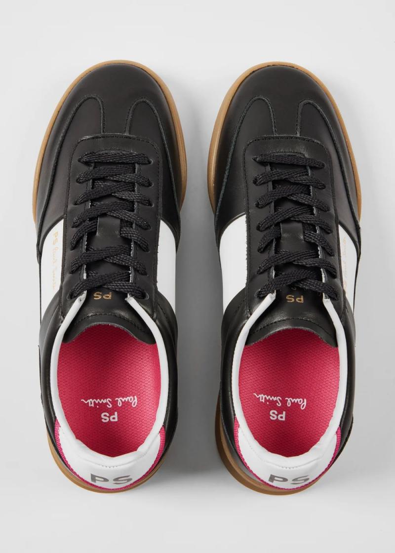 Made in Portugal from premium leather uppers with a smooth finish, these black ‘Dover’ trainers feature white side stripes with foil-embossed logo. Complete with a gum rubber sole and fuchsia trim for a signature flash of colour.